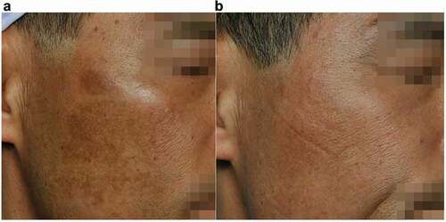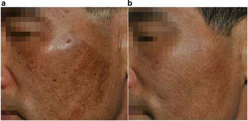 Case 3: A 47-year-old man with post-inflammatory hyperpigmentation on both cheeks. The patient had received intense pulsed light therapy and laser toning; but the treatment proved ineffective as the patches worsened. (a) Before treatment (b) After treatment of PICOHI 300ps Laser device.PICOHI 300ps Laser