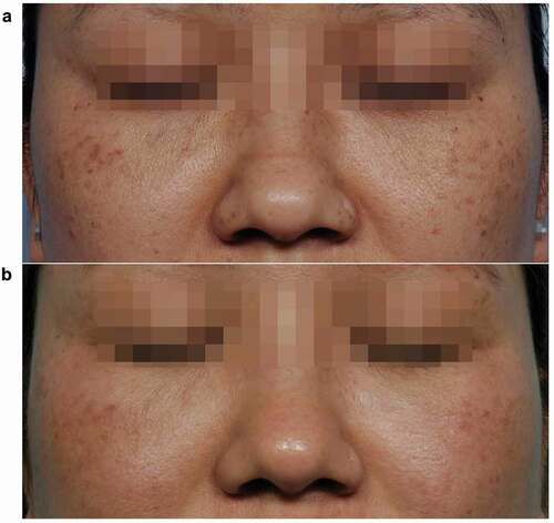 Case 1: A 30-year-old woman with complaints of brown-colored pigmented spots on both cheeks and the nose. (a) Before treatment, (b) After treatment of PICOHI 300ps Laser device.
