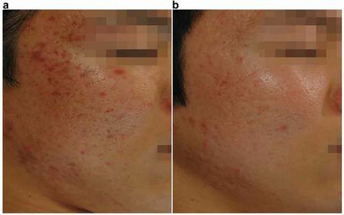 Case 2: A 27-year-old man with acne scars. (a) Before treatment, (b) After treatment of PICOHI 300ps Laser device.