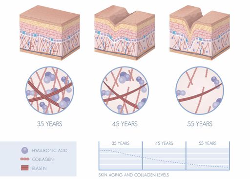 With age, the body produces less collagen. The structural integrity of the skin declines. Wrinkles form, skin becomes thinner and sags while ligaments lose their elasticity, joints get stiffer and much more.