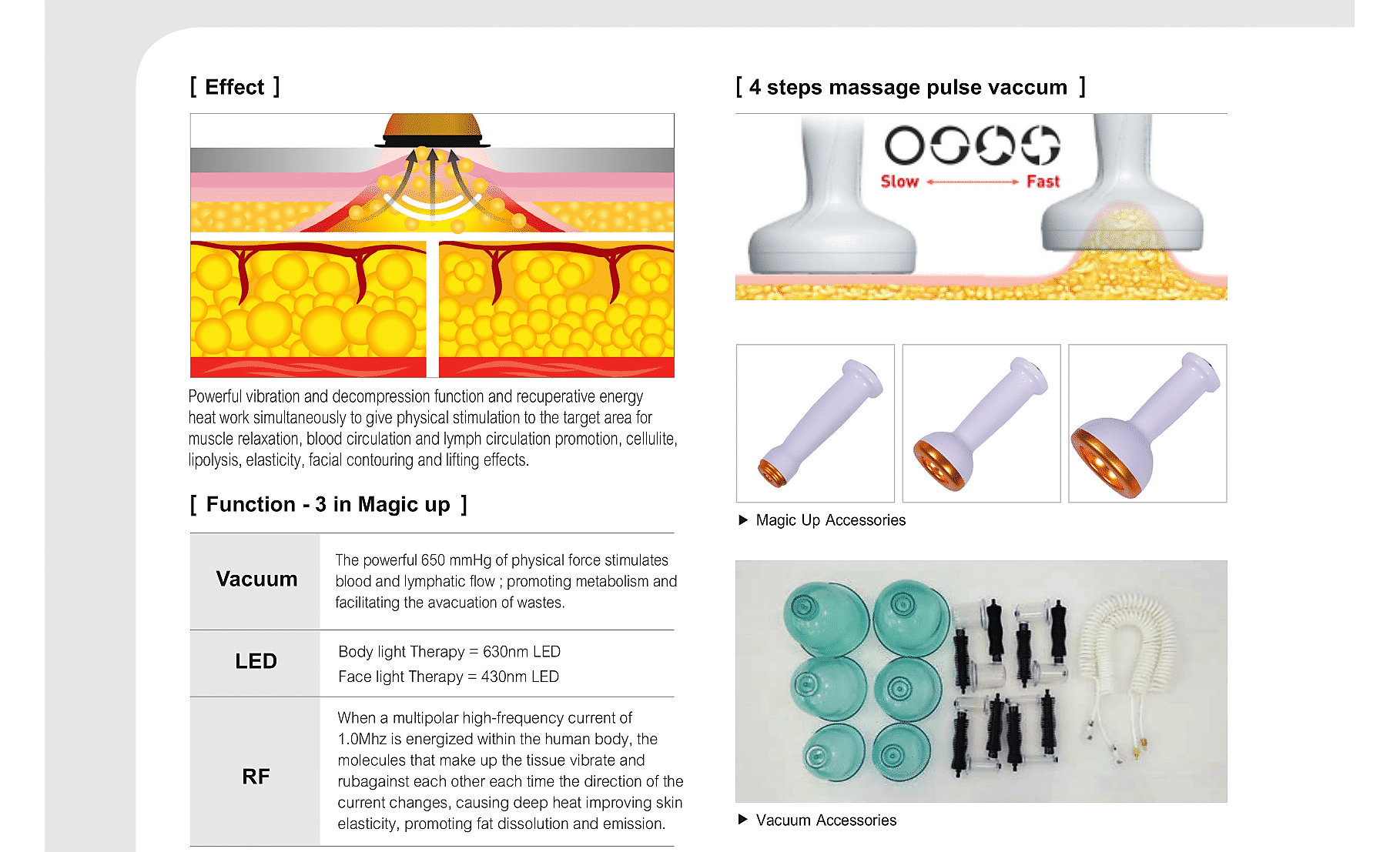 • Powerful vibration and decompression function and recuperative energy heat work simultaneously to give physical stimulation to the target area for muscle relaxation, blood and lymph circulation promotion, cellulite, lipolysis, elasticity, facial contour, and lifting effects